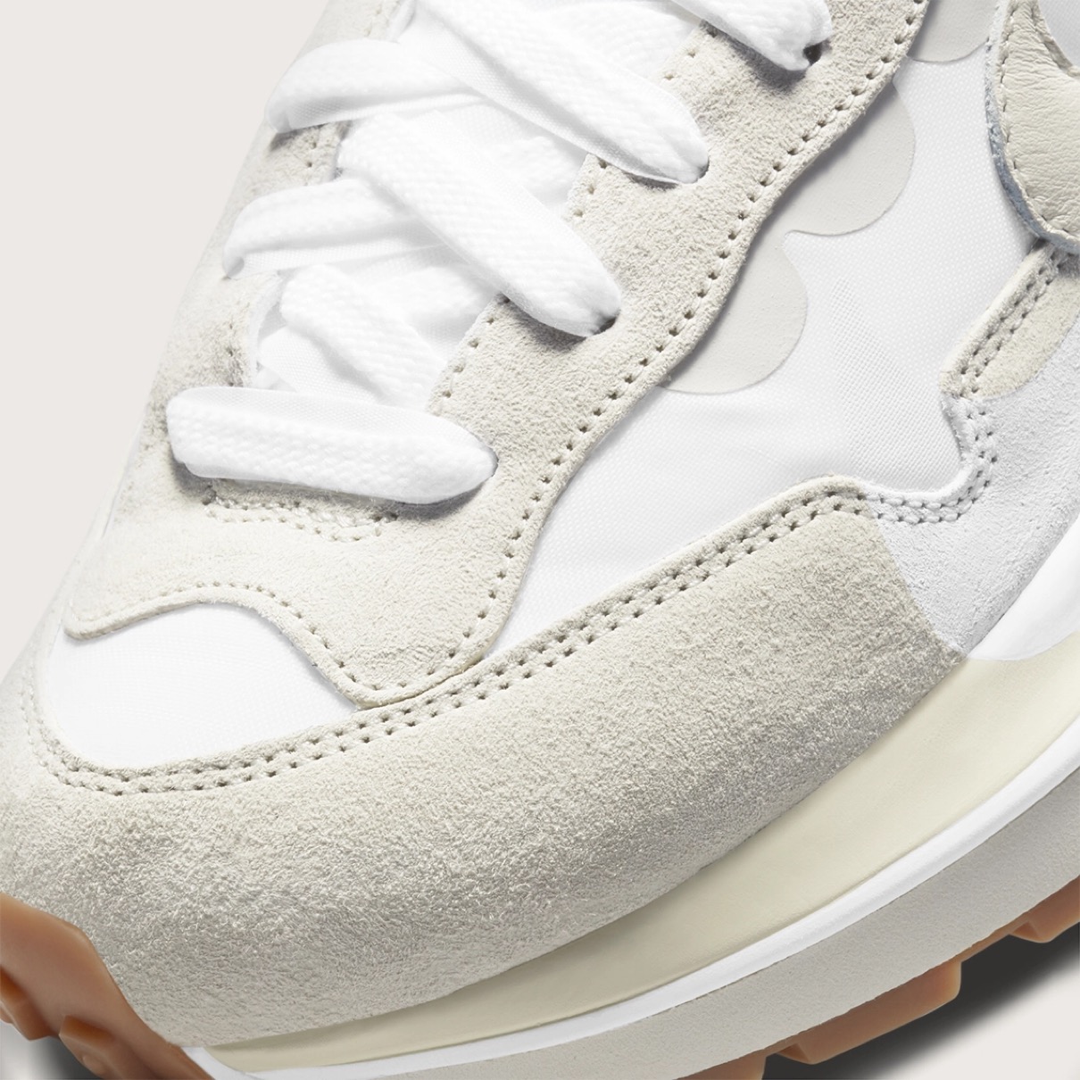 2つのアイコンの融合、ナイキ x sacai ヴェイパーワッフルが表現するのは、Nike Runningの過去と未来。ナイキ ヴェイパーフライと1983年のクラシックなペガサスの組み合わせに、sacaiならではのエッセンスが加わり、限界を打ち破るスタイルが誕生した。今回のヴェイパーワッフルは、ディテールを変えたベーシックな同系色スタイルで登場。ブラックのナイロンのベースがオフノワールのスエードとレザーのオーバーレイとマッチし、ブラックとオフノワールのコントラストの効いた二重のシュータンがスタイルにさりげなく変化を加えている。ニュートラルでありながらも際立つスタイルを完成させるのは、ガムラバーのアウトソール。どんなコーデにもマッチする、普段着に最適なスタイルだ。